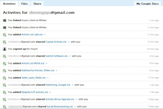 Any updates to any files in Google Docs will be shown in real-time by a pop up notification in your system tray. Also the changes would be reflected in activities page of Insync. The three tabs at the top of the page are as shown below. Activities Tab: The first tab shows all the recent activities in your Google Docs account. Files Tab: The second tab shows all the files or folders created by you in your Google Docs account. Share Tab: The third tab shows all your shared files, folders and links. For sharing a file, all you have to do is, go to the Files tab, click on the small blue arrow given at the end of the file name. That will open up a menu which has the share option in it. When you click on share, you will be asked to enter the name or email of the person you want to share this with. If you enter a name, a drop down list will open up with a list of names from your address book. Just select the name of the contact you want to share this file with. Another option in the drop down menu is Get Public Link, using this option you can get a link of a file which can be shared publicly. Disabling the sharing option is also simple. Just look under Collaborators on the right hand side window. Every person you are sharing the file with has a remove button in front of their name. Just click on the remove button, to remove a person from a shared doc. While syncing a file or folder will show a Blue sign on it and when syncing is completed it will show a Green check mark. Overall, Insync is a useful application to have on your system. It will be much easier for you to update your Google Doc files right from your desktop from anywhere. Related posts: