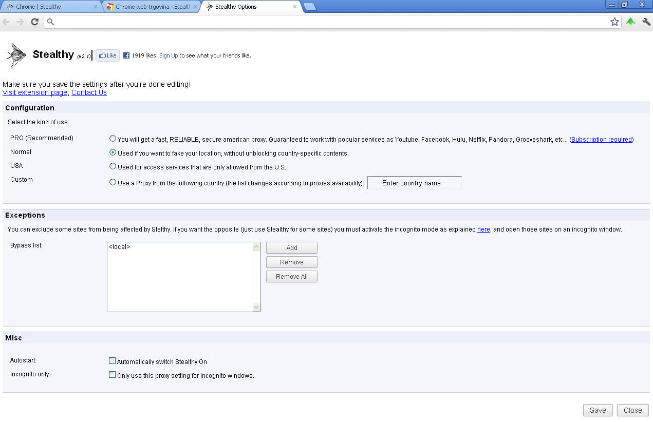 | Free Anonymizer for Secure Browsing: Stealthy Posted: 30 May 2012 06:30 AM PDT Stealthy offers you the ability to protect your privacy, and to avoid content filters imposed either by your company, school or even government. Stealthy is a browser plugin, available for Firefox and Chrome that will scour the web for free proxies and it will automatically configure them to protect your real identity, and it will also allow you to go places and see things that you normally wouldn’t be able to visit and enjoy, because you’d be blocked. Schools and companies are known for blocking computer users on their networks from websites like Facebook, YouTube, Twitter, Flicker and all the other popular social hangouts. Why that is the case is pretty obvious, so that they don’t waste time on them. Some countries unfortunately have regimes, which are controlling which websites people are allowed to visit from their own homes, Iran and China would be great examples. Even some western countries have problems with this type of content censorship. Have you ever opened a YouTube music video only to receive a message that it is not allowed in your country due to copyright infringements? With Stealthy you can avoid all these problems, all that you have to do is install a small plugin in your favorite browser and click start. Installing and using Stealthy in FirefoxThere are instructions on the Stealthy project homepage about how you can install the plugin to Firefox on your desktop and also on Android Firefox, which means that you can use this anonymizer even on your smartphone. What you see on the image above being indicated by the red arrow is Stealthy. This icon in the browser toolbar is all that you will see from this program and you can activate it by clicking on it and making the icon turn to red. When Stealthy isn’t working the little airplane icon is red. What Stealthy does can be seen if you open up Tools >> Options >> Advanced >> Network and select Settings. There you will see that Stealthy has configured your browser to use proxies and automatically filled in the proxy fields with the IP address and port number of a proxy that it has found: Installing Stealthy in Google ChromeIf you are using Chrome and you are interested in changing the IP address that the world sees, then you need to install the Stealthy plugin for Chrome. It’s available for installation from the Chrome Web Store. After the installation is complete you will be offered to configure the basic Stealthy settings: These are pretty basic settings, notice that you are offered the Pro version of Stealthy, there is a paid version of this plugin which offers better performance, here’s how Stealthy looks in Chrome: Advantage of the paid version and conclusionsThe Pro version of Stealthy offers you only top quality US based proxies, which will work for sure with social networks and sites. Free version adds random working proxies, from random countries, which might not always be the best choice because you are still blocked and censored, for example if you get German proxy, some YouTube videos will still not work. With paid version you avoid these kind of situations and also the proxies have better quality. No related posts. Free Anonymizer for Secure Browsing: Stealthy was originally published at I Love Free Software |