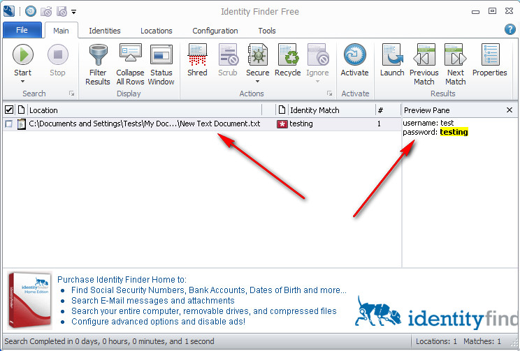 Of course these are not a genuine account, but Identity Finder didn’t know that, and it has detected the document which we’ve created, see image above. All that was necessary for detection was the keywords uesername and password to be present in a file, and it turned up as danger very easily. File formats that Identity Finder can read and scan through are:
