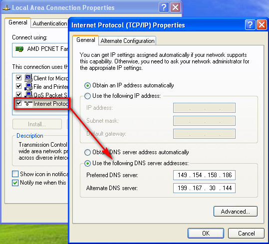 Into the quick run field of Windows 7 or Vista Start Menu. A list of connections will appear, choose your network connection, the one that you use and then click Properties. Under This connection use the following protocols choose IPv4 and then hit Properties once again. Window that you can see on the right will appear and there change the DNS server settings that you can see on the image above to the ones that are offered by Tunlr: