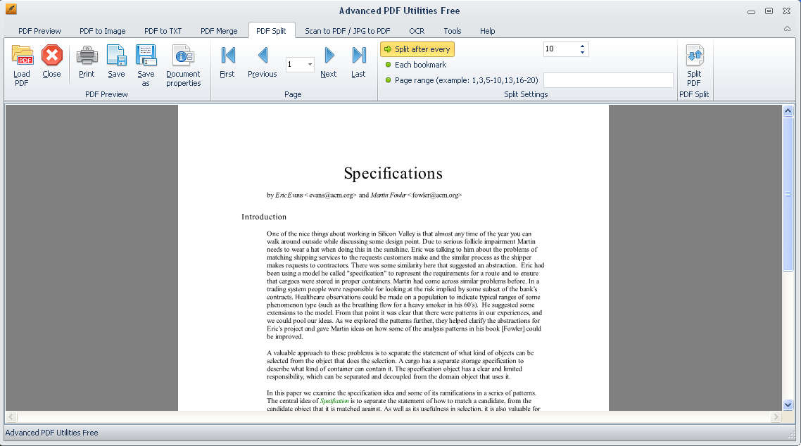 A very impressive list of features, and best of all, they are all rolled up into a single application, let’s see how they actually work, or if they’re here just to look at. Similar software: Perfect PDF Reader, PDF Preview, PDF Xchange Viewer. Convert PDF files to Images with Advanced PDF Utilties FreeConverting PDFs to images can come in handy if for example you’re unable to afford a PDF reader, but you can display images on your media player. Converting isn’t that difficult to grasp, simply load the PDF files you wish to convert to images: Click on the Convert button on the far right and then simply wait for the application to churn out the images in the selected destination folder. Cut and merge PDF files for FreeSplitting and merging PDF documents is very easy with Advanced PDF Utilities, again you load up the document that you wish to cut, and then set the splitting parameters, if you want the document cut after a certain number of pages, between pages or on each bookmark. On this image: we’ve decided to split the document after each 10 pages. With this setting you can even cut a document in half, for example cutting a document each 10 pages means that a 20 page document will be cut in half. Other cutting options are also available. ConclusionWe already talked about some of the tools from this ensemble, for example we had a review of the free OCR component before. Other tools can come in very handy, especially the Scan to PDF option for which you’ll need a scanner of course. Advanced PDF Utilities has a lot to offer, and you should really give this PDF utility a try, because the number of tools it offers is just to good to pass up, and best of all it’s free. Related posts: