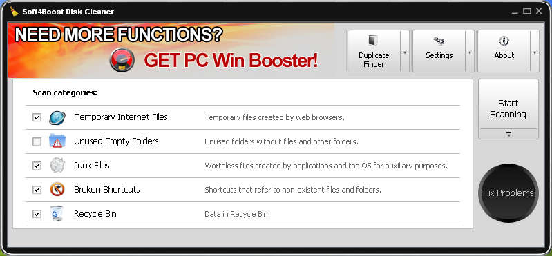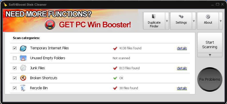 These are not the only places where Soft4Boost Disk Cleaner can free up your disk space, there is another option at the top right corner called Duplicate Finder, which is very useful for all those who have large data collections. This feature will look for any files which have the same name, and then it will offer you to choose the ones that you want to delete in order to free up space. Let’s first see how exactly can we get rid of unwanted files with the basic cleaning options at our disposal. Similar software: Kingsoft PC Doctor, Argente Utilities, Windows Repair. Delete junk files with Soft4Boost Disk CleanerThe 5 system areas that can be scanned and from where junk files can be deleted are listed above. For those who are not familiar what exactly each one of these options will delete, here are short explanations. Temporary internet files are files which internet browsers create when visiting websites. Each website is made up of files, which have to be downloaded to your computer before being shown. With time these files can eat up a lot of disk space, especially if your browser’s temporary files storage is set to very high. Be careful when working with Unused Empty Folders options, which will delete all the unused folders. You might delete folders that are empty now, but which are needed by other programs later on, and if they are not there, you might receive errors. Broken shortcuts are shortcuts that are left after you delete a program. Leftover installation files and system temporary files are what falls under the Junk Files category. Last cleaning method, Recycle Bin should be pretty clear to everyone, so we’re not gonna mention it. To find files click on Start Scanning program will then list them on the left side. After you do that clicking on the Fix Problems will start deleting unwanted files. Find and delete duplicate files and foldersSearching for duplicate files and folders is very easy. Just select the location where you want to look for duplicate files, add it to the list, choose which search parameters you want and then hit Start Scanning. After the scan is finished, just click on Fix Problems and you’re done. Soft4Boost Disk Cleaner offers a lot of options for speeding up the computer and deleting unnecessary files, so make sure to try it out, it’s free. Related posts: