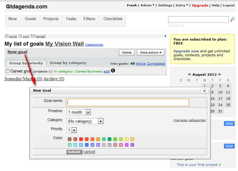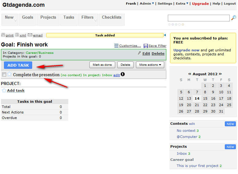 Paid plans allow you to create more goals, more expensive ones offer unlimited numbers of all of the above mentioned GTDagenda features, with an option to add additional users. Immediately after you register you’ll be greeted with the default window, see image above, where you can start creating goals, projects and everything else that’s important for getting things done. Similar software: MyLists, Panmind, Goalforit. How to set goals and manage personal projects with this task managerAs you can see from the image above, when you login to your GTDagenda account you will see separate tabs for goals, projects, tasks and checklists. To setup a goal, something that you’re currently aiming for and want to achieve, you need to click on the Goals tab, and there click on New goal. Add new goal window will pop-up where you’ll need to enter a name, decide on the time in which you would like to complete the goal, choose category, set priority and also set a specific color so that different types of goals can be more easily spotted later on, use red for work related goals for example. On the image above, we have a goal created and opened. If you want you can add tasks because let’s face it, to complete a certain goal or a project you’ll have to do several things, unless its something easy like taking out the trash. For this reason you can add tasks, use them as mini goals, as stepping stones for completing the main project or a goal. ConclusionSetting up goals, whether they are personal or professional, can help out a lot if you’re having problems with keeping focus and not doing the work that you’re supposed to be doing. Research showed that when you have goals set they make you more motivated since you have a deadline, a time frame in which you need to complete the task at hand, for yourself or for your boss. GTDagenda can help you set goals and create projects, have them on paper, so to say. Free GTDagenda account is more than enough if you don’t set too many goals for yourself, which can be a bad thing, so give it a try and see how it goes. Related posts: