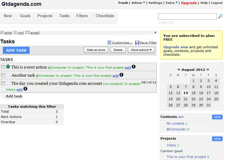 | Free Online To Do Task Manager: Gtdagenda Posted: 16 Aug 2012 06:30 AM PDT GTDagenda is an online task manager service where you can set personal goals, create task lists, and manage important projects that you’re working on so that you can be more successful and so that you actually get things done. GTD in GTDagenda means, “get things done”, and with this free online task scheduler and planner you can increase your productivity and finish work ahead of deadlines. To use GTDagenda you’re gonna have to register on the GTDagenda website, since this is an online service which you can also access from your mobile, there’s an iPhone app that users can install. While you’re registering you’ll need to select which plan you’d like to use, because next to the free one, there are also paid plans where you get to create more goals, projects and you also get storage for uploading files, which isn’t available in the free account. With the free account you get: