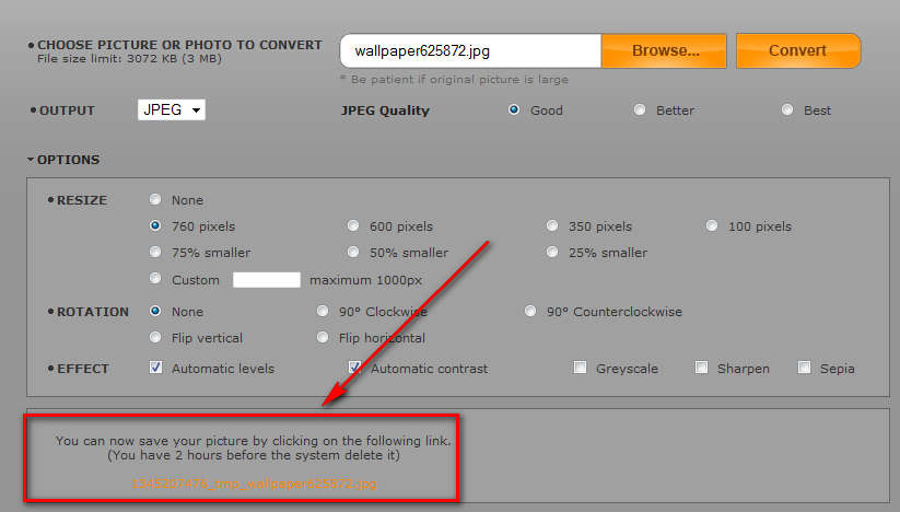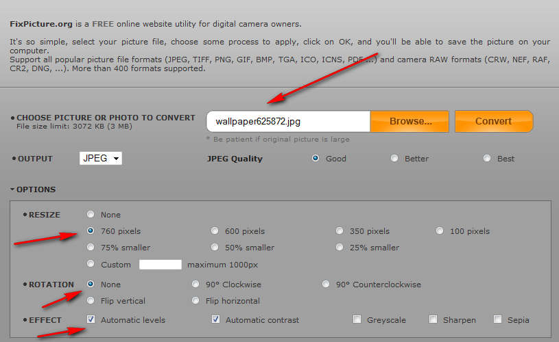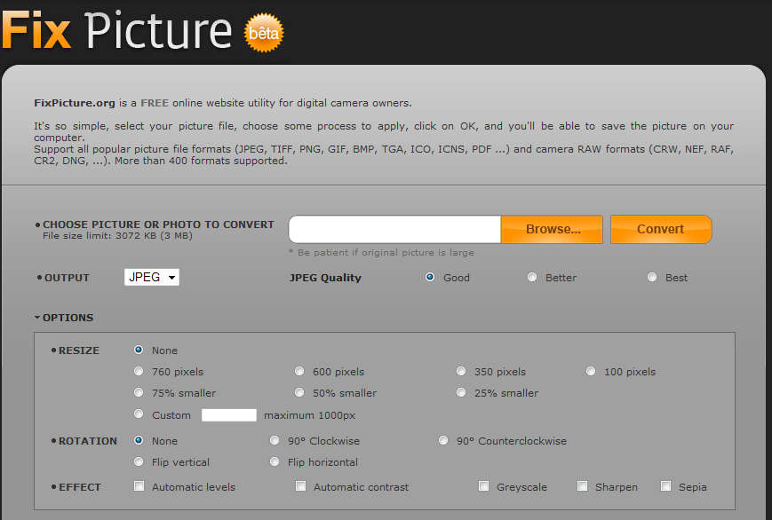 Image that you can see above is where all the magic happens, after you’ve loaded image which needs to be edited or converted, you need to go through all the options down below. Options might be hidden from view, but they can be easily activated by clicking on the Options tab, once you do that, you’ll be able to see what can be seen on the screenshot above. Similar software: Retouch Pilot Pro, RawTherapee, Funny Photo Maker. How to edit and convert photos with Fix PictureImage above shows us how easy it is to use this free online photo editor. By clicking on Browse we were presented with the standard image selection window where you can select image that you want to manipulate, only one, this is not a batch converter. Under Output, select the desired output format and quality, after which you can move on to the Options tab. There we decided to resize the image, and also to make automatic changes to color levels and contrast. Once we marked all the images edits which we wanted to apply, the only thing that was left to do was to click on the Convert button. The entire process of uploading and converting images didn’t take long, and upon completion we were presented with the download link further down the screen, below the image editor. Our image was resized, and color corrections were applied just fine. ConclusionSometimes we find ourselves in situations where we don’t have a photo editor installed on the computer that we’re using, but we need to edit photos and that’s exactly the kind of setup where Fix Picture online image editor can come in to save the day. Open the browser, visit the Fix Picture website, upload your image, select the changes that you want to do and then simply leave this free online image editor to do it’s thing. Once everything is done, just click the download link and grab your converted and edited photos. Related posts: