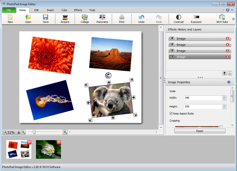 Simplest way of how you can start using PhotoPad would be by clicking on the Open new file from the welcome window that we mentioned before. After you do that, you’ll be able to see a very professional looking image editing area, where you can easily make changes to your photos and pictures. Similar service: PicBackMan, PhotoOnWeb, Imagebox.com. How to edit images and photos with PhotoPadFrom the size of the PhotoPad installer you would have never guessed that this free photo editor has so many image editing tool. With less than a megabyte in size, when you open an image inside PhotoPad, you will be greeted with the following screen: Majority of tools important for image editing are available in the upper toolbar, the one that’s all the way next to the top window border. On the image above we have the Effects tool tab opened, and you can see that we applied it to the main image at the center of the screen. On the right we also have a new layer added called blur, with a red x standing next to it, which you can use if you don’t like what you’re seeing and would like to remove the effect. Effect properties window can be seen in the lower right corner. That’s how every tool in the PhotoPad operates. To create image collages, you need to click on the Collage button available in the Home tab, which will then open up the Create collage window where you need to select the size and add images for the collage. After clicking on Create, you should see something similar to what can be seen on the image above, only your image won’t be skewed, we did that using the transform handles which can be seen on the koala image. ConclusionPhotoPad is a very small and lightweight application which brings a lot of interested tools. With the Panorama tool you can stitch together several smaller photos so that they make a larger panorama type of photo, the collage tool you’ve already seen in action. Even without these two tools PhotoPad has a lot to offer and everyone should try it out. Related posts: