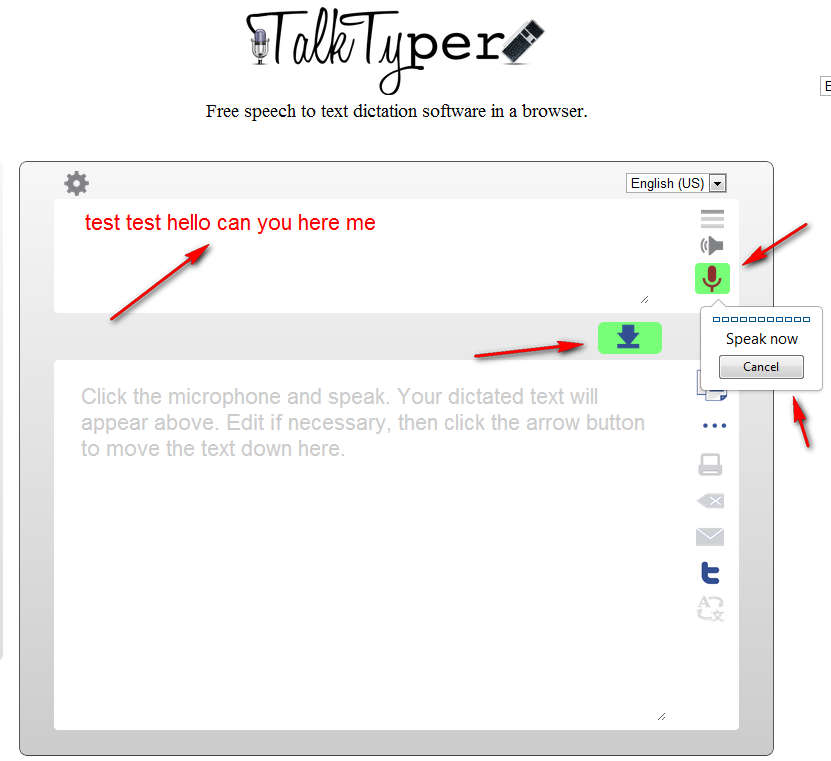 How accurate these are, we can’t be sure since we don’t speak them, but when it comes to English, as you can see from the image above, a very large number or words was detected properly. The only problem was that “hear” was confused with “here”, but that’s a small blunder which are always present with speech to text apps. Once that you finish dictating, click on the arrow that points down, next to the microphone. That’s gonna transfer the dictated text to the editing area where you can correct mistakes before copying finished text to emails, text documents or wherever else it needs to go. ConclusionSeeing how this is a browser speech to text service it’s more than praiseworthy. You can use it to dictate letters, how accurately is it gonna be depends on you as much as on the software itself, so like we said try to be as clear as possible when speaking. Annunciate words properly and there should be very few mistakes present. Try TalkTyper free. Free Online Speech to Text was originally published at I Love Free Software Related posts: