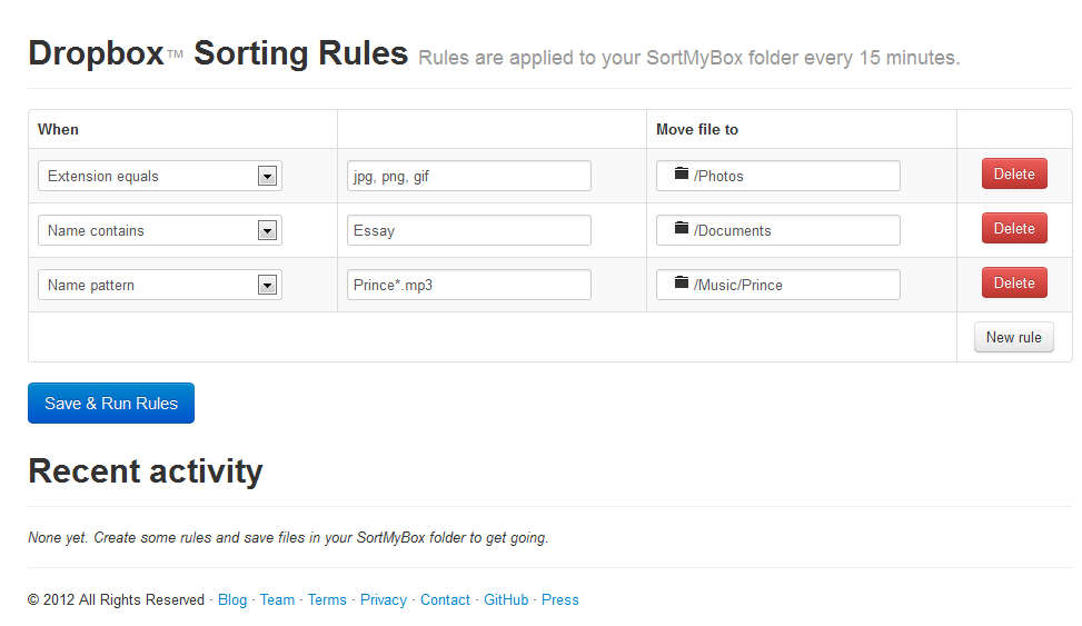 | Free File Sorting for Dropbox and Box with SortMyBox Posted: 08 Sep 2012 05:45 AM PDT SortMyBox is a free online storage file sorting service which is gonna connect to your Dropbox or Box account, create a folder for itself there, a folder that’s gonna be checked every 15 minutes and every time that you upload files into the created folder, SortMyBox is gonna automatically arrange files according to the rules which you’ve created in your SortMyBox account. In essence SortMyBox is an online file management for online file storage services, two of the most popular ones to be more precise, Dropbox and Box. To use SortMyBox you’re gonna have to allow it access to the online storage accounts that you want to use. Only Dropbox and Box are supported, like we already mentioned. Once that you connect to your account SortMyBox folder is gonna be created and you should be able to see it when you are browsing through your account. This is the folder where all the documents and files that you want sorted automatically are gonna go. Available rules for sorting are: