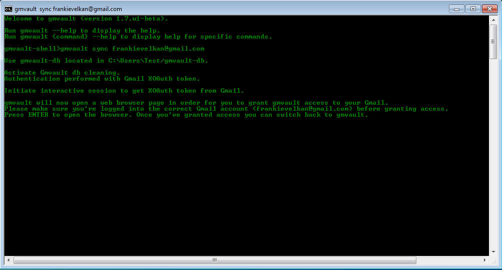 Where of course the first part has to be changed with your actual account name. After you type this in you should be greeted with an authentication message, you have to type in the password to access your account, you’re doing this in a web browser where a token is gonna be generated. When the authentication is completed, Gmvault is gonna automatically start backing up your emails. Gmail account is gonna be backed up in your My Documents folder, it should be named gmvault-db. Authentication is gonna be left stored and you won’t have to go through that process again when you want to perform another backup or when you want to restore the existing backup to the same account. To do a restoration, run the following command.