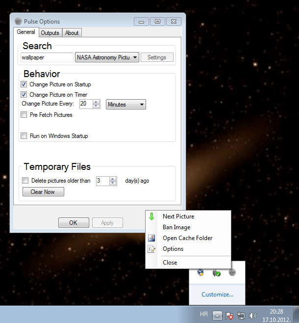 Interesting feature which can be found in Pulse would be that some of the image hosts, or in case of Google, image search engines, have their own settings which you can change. For example when it comes to Wallbase you can login your account there, allow sketchy images and other smaller settings related to the type of wallpapers that are gonna be downloaded. How to Download Wallpapers and Change Windows 7 Backgrounds Automatically?To set up Pulse, right-click on the system tray icon of it, after you’ve started it and from there select Options. You’re gonna be greeted with the options window which can be seen in the image above. In the Search section, enter the keywords for the kind of wallpaper you want to see on your desktop. Default is gonna be “nature”. We searched for “wallpapers“, on the NASA website and as soon as we saved the settings, desktop background changed. You can set the time according to which the background is gonna be changed automatically, and if you do not like the image or would like to change it, right-click on the tray icon and select Next Picture or Ban Image if you don’t want to see it anymore. This would be the settings window for Wallbase, where as you can see there’s also an option for logging in, or selecting the website area from where you’d like to fetch images. Save all the settings and leave Pulse running in the system tray, from where it’s gonna download wallpapers and change the background automatically. ConclusionPulse comes with several user-friendly options, there are so many options that we haven’t covered in this post. So if you are interested in downloading and changing desktop wallpapers automatically, Pulse is the thing for you. Try Pulse for free. Pulse: Free Wallpaper Downloader And Wallpaper Changer was originally published at I Love Free Software Related posts: