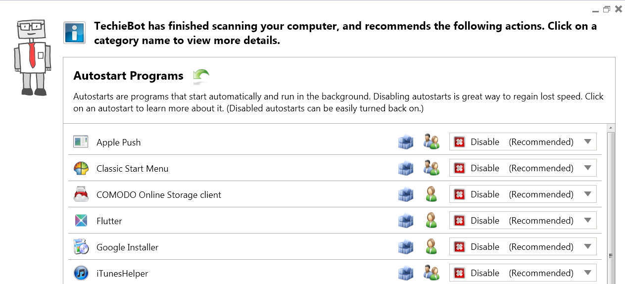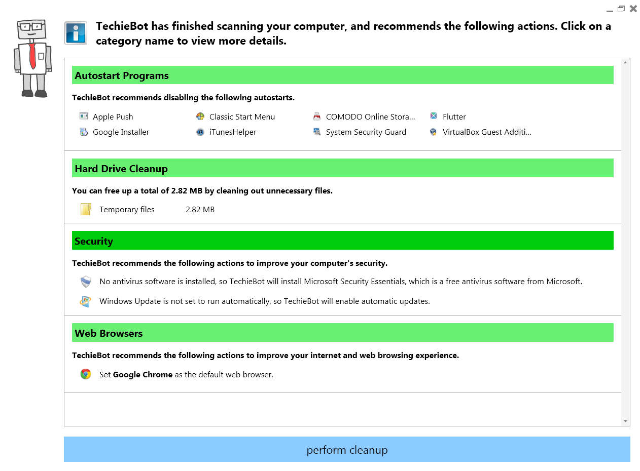Each one of these options are crucial in keeping your computer running faster and preventing possible malware infections. After clicking on the scan button, TechieBot will start working, it might be a bit longer if you have an older computer which is working slow, and when it completes the scan, then you will see the full extent of the damage. Similar software: Crap Cleaner, Tweak Me, Fixbe. Speed up your computer and increase security with TechieBotResults of the scan are displayed very neatly, and even if you don’t have a lot of computer experience you”ll know what some of these would be. The first option, Autostart programs, would be programs which start working with Windows, as it turns on. If you install a lot of programs, then each one of them might nest itself in autostart, work in the tray hidden without you knowing. TechieBot will detect them and offer you the option to disable them. The second scan result would be the standard junk removal report, which comes included with other free system optimizer applications. TechieBot will scan for and if you so choose delete unnecessary system files, left over installation or de-installation files which could cost you valuable disk space. Security and web browsers tabs are where you will be warned about problems with your computers security settings, the main ones being that security updates are deactivated, either on Windows or on your main AV program. Each one of the suggested actions by TechieBot can be changed as you can see on the image above. If you know what a certain program does, and you want to keep it working then click on Enable on the right, after which click on Perform Cleanup button at the bottom and enjoy your newly optimized PC. TechieBot is completely free, so you lose nothing by trying it out, if you have a slow computer, it will definitely help you out. Related posts: