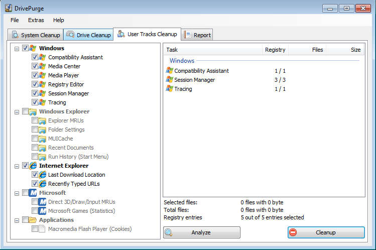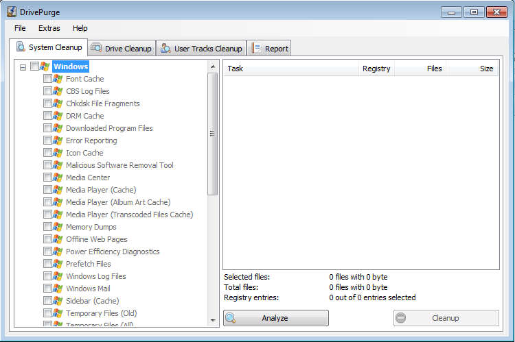 Each one of these has several different subgroups of system locations, applications and registry entries which will be scanned and where system problems can be detected. According to the creators of DrivePurge there are over 750 different system areas, applications and registry entries for which this free system optimization software can find errors, and you can use it to improve the speed of your system completely free of charge. Similar software: Crap Cleaner, Tweak Me, Fixbe. System cleanup with DrivePurgeIf you browse through the DrivePurge System Cleanup tab, the first one located in the top left corner, you can see which system locations will be deleted exactly, and choose the ones that you want deleted. As you can see on the image above, you can select each one of the items in the category individually or you can select the entire category and have everything cleaned. If you’re unsure what to select here, you can go ahead and select everything, at least when it comes to the Windows category, because pretty much everything can be deleted from there. Be careful when it comes to purging Application files, because it’s possible to delete something important from there, deselect the applications that you don’t want cleaned. Here we have the same cleanup that we had for the system, only here we’re now cleaning the entire hard drive, and as you can see on the right, we’re cleaning old files, backups and temporary files with this option, and you can free up a lot of disk space with this option. Last cleaning option that DrivePurge offers would be the User Tracks Cleanup where you can delete your computer usage history, from recently opened documents in Windows, to browsed web pages in Internet Explorer. If your computer is working slow, and if you have problems with disk space shortage, then you should try scanning your computer with DrivePurge and see if that could maybe help you improve your situation a little bit. This cleaner application is free, and since there is no installation you don’t even have to waste your time installing it in order to see how good this free system cleaner is. Be careful when deleting, you don’t want to delete something important, like browser logins, because you will do that with DrivePurge, next to everything else which was said, so give DrivePurge a try and see how it goes. Related posts: