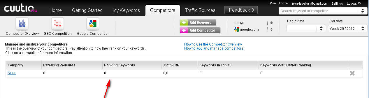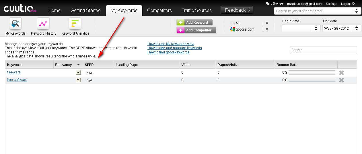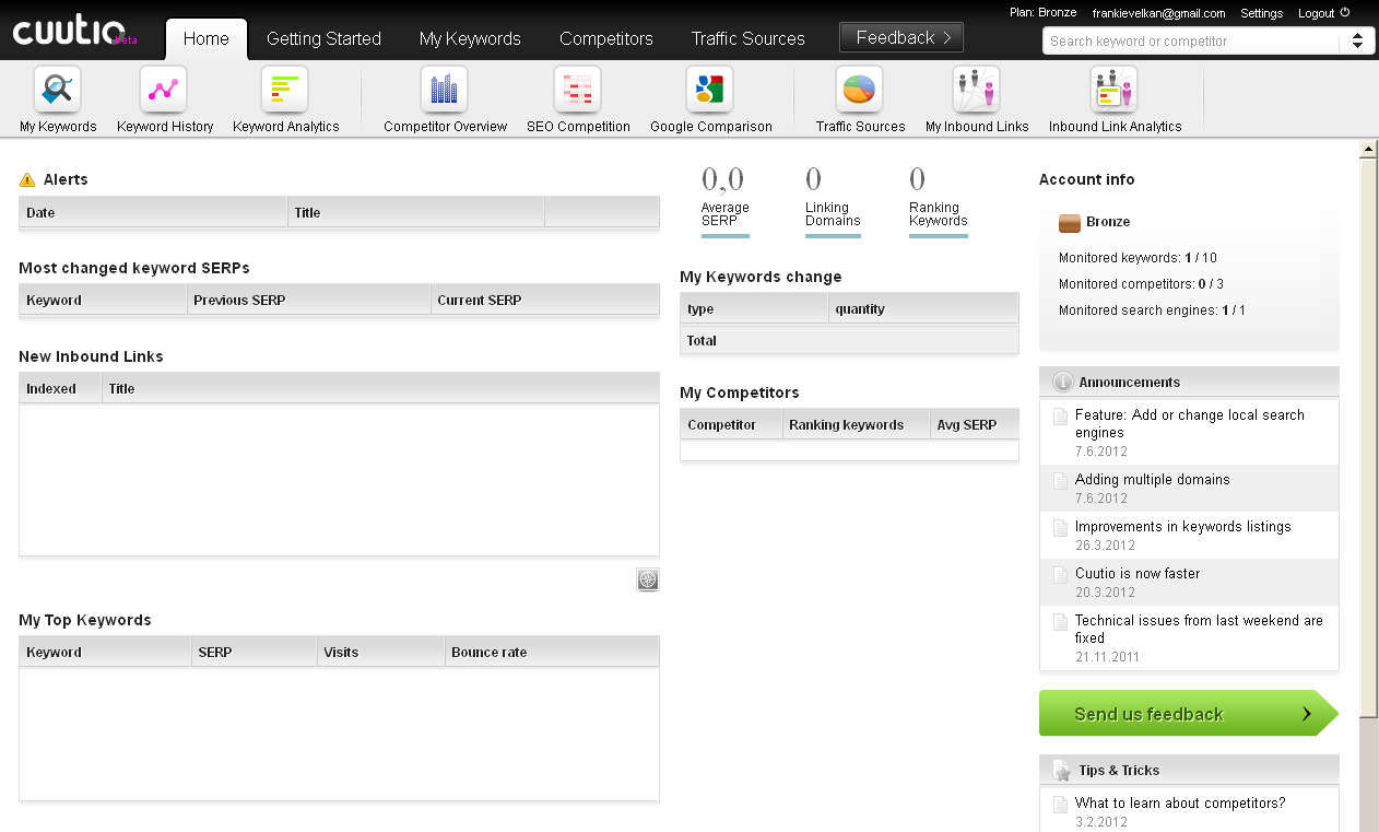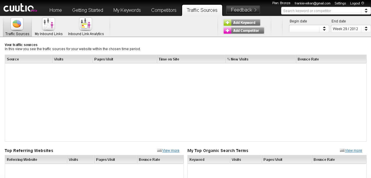 Registration is necessary before you’ll be able to use Cuutio service, and during registration you’re gonna have to configure the website who’s SEO position you’d like to check and monitor. Don’t worry it’s possible to change data later on when you login into your Cuutio account. This is the default window that waits for you after you’ve registered with Cuutio and after you’ve logged into your account. There’s no information shown because some time needs to pass after you’ve created your account and started using the service for the data to start coming in. Search engine ranking position or SERP is very important thing to know, track and improve, and every webmaster should take a note of it, Cuutio can help you out a lot in that department. Similar software: Firefox Google Page Rank Plugin, Rank Checker, SEO Toolbar. Free search engine ranking position tracking with CuutioTo start checking and tracking if your website is properly optimized for search engines, you’re gonna have to add the keywords that you’re interested in tracking, you do this in the My Keywords tab: Limitation of the free account would be that you can only add up to 10 keywords which you can track and monitor. To add a keyword, click on the Add button seen at the top of the application window, enter the keywords that you’d like to track together with the language of the keyword and then hit Add. If everything is properly configured you should start receiving the SEO statistics in a few days. SEO has become a very though industry and if you want to stay ahead and keep your website at the top, you also need to keep track of what competition does. You can also do this with the help of Cuutio, simply click on the Competitors tab, hit Add Competitor fill out everything that’s asked from you and them simply sit back and wait to start receiving data, what the SERP of your competition is. Cuutio wouldn’t be a SEO monitoring service if there weren’t tools which you can use in order to monitor what kind of traffic sources and what kind of inbound links your website has. To check this click on the Traffic Source tab, and there you should see, once that the data is updated, information on what kind of traffic and from where it is coming to your website. If you are looking for a tool that you can use in order to assist you in keeping up to date with the SERP of your website, you should then start using Cuutio. Free search engine ranking analytics. Related posts:
