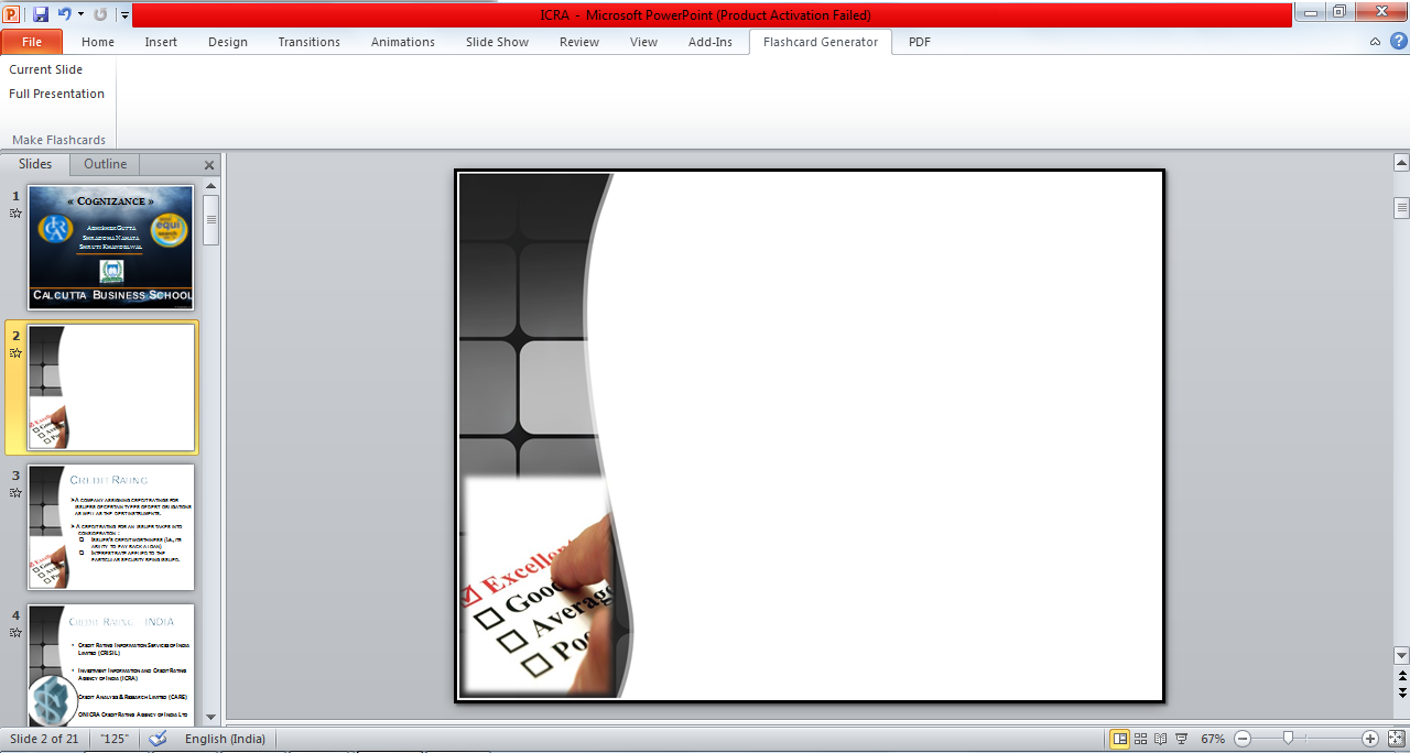 | Create Flashcards from PowerPoint: Free Flashcard Generator Posted: 26 Jul 2012 09:30 AM PDT Flashcard Generator is an effective way to create flashcards out of PowerPoint presentations. The process of creating flashcards has been simplified by this software where you need not do much besides clicking a few options from your Microsoft PowerPoint screen only. Free Flashcard Generator comes in very handy to the professionals and the students who are in constant need of creating presentations and convert them into flash cards. Moreover, this free flashcard creator also comes in very handy for people who are in search for software that could help them in converting their presentations instantly. You can create flashcards automatically using this freeware. Installing Flashcard GeneratorTo install Flashcard Generator you need to visit their site here and click on the download link available. Once you click on the download link the zip file containing the installer gets downloaded on your system. You need to unzip the files and run the setup file to install the Flashcard Generator on your system. The program upon installation gets integrated with Microsoft PowerPoint and can be used directly from the program itself. You can also try Flashcard Master, Anki and 5 Free Flashcard Maker reviewed by us. Using Flashcard Generator to create flashcardsTo use Flashcard Generator you need to open a Microsoft PowerPoint file after which you would see a newly added tab on the menu bar. The tool comes with two options in it i.e. creating a flashcard for a single slide or for the entire presentation. In case you want an existing presentation to be converted into a flash card you need to open the presentation and use this tool. Moreover you may create your presentations inside the default window itself before converting them to flashcards. The 1st step is to click in the option you wish to go for (single slide or entire document). For the 1st time you click on it you would need to accept the User license to proceed after accepting that you may proceed using the application as and when required. Now when you are brought back to the main window of your presentation you need to click on whether you wish to convert each of your slides into flashcards or a single slide. Once you do so you would see an added slide before the slide you created the flashcard for. Hence when you run the presentation the flashcard would appear before the other contents on the slide. Basically all the materials which you have as your background gets displayed as the flashcard and the rest of the contents appear only when you press a key. It is quite handy when you need to hide the elements to appear at the start of the slide. So with the help of this feature you could definitely make it much easier to explain slides and the contents on them. Now that you know all about Flashcard Generator, you can use this freeware to create flashcards automatically. No related posts. Create Flashcards from PowerPoint: Free Flashcard Generator was originally published at I Love Free Software |