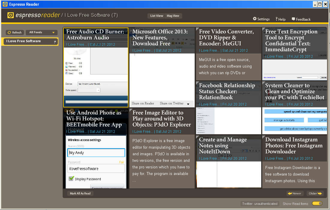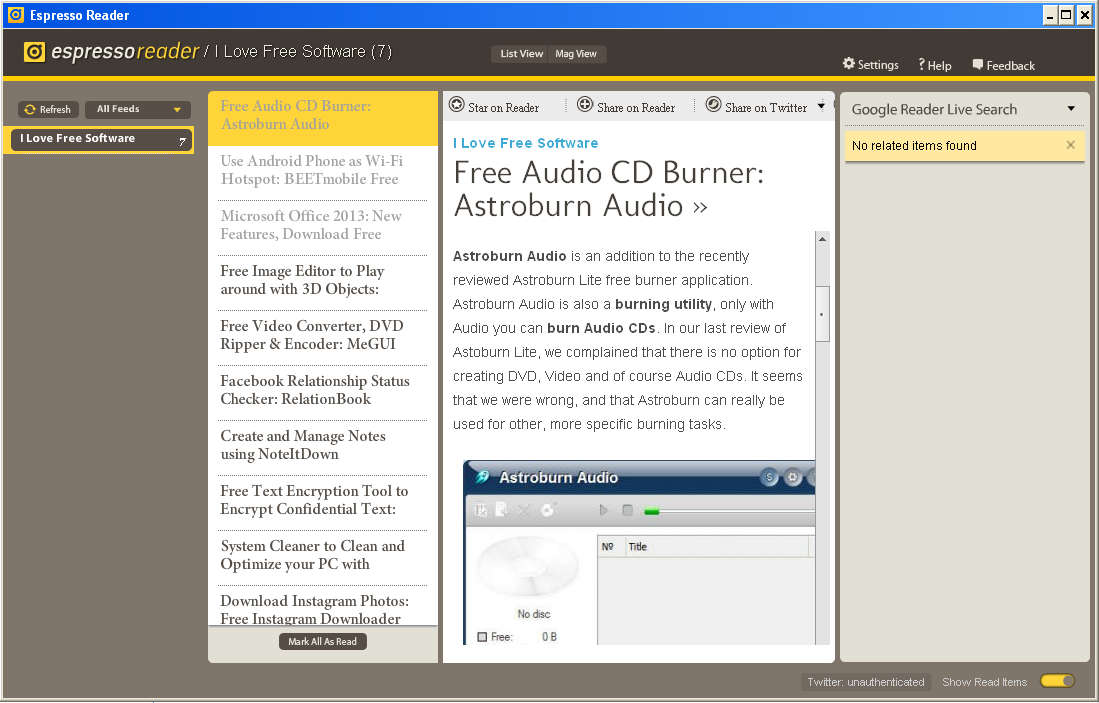 - Free Google Reader Desktop Client: Espresso Reader