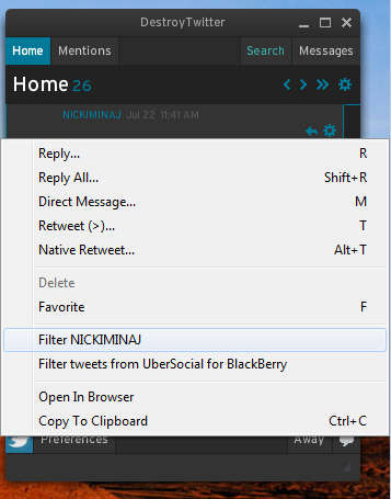 Interface of Destroy Twitter is very modern looking, it will run in the system tray, like any other instant messaging application and it will behave like one too, sound and pop up notifications are there, and you can even send tweets from it to. Similar software: Tweetz, Hahlo Twitter, MetroTwit. Free Twitter desktop client for Windows, Linux and MacAfter installing Destroy Twitter it will start working right away, a login window will wait for you, where you need to surrender your Twitter login details. After you do that, you will be greeted with a list of tweets from your home page: When you’re hovering over tweets, two different buttons will appear at the bottom right corner of the tweet, one of which would be the reply to tweet option which you can see above. Great thing about Destroy Twitter reply features is that it sports a spell checker which will underline misspelled word, and offer you suggestions for correction after you right click on it. Next to being notified and reading new tweets with Destroy Twitter you also get the ability to track Mentions, search for friends, for those who have a lot of them and read Messages. Image above shows a user search which has yielded results and is now displaying both a list of tweets made by that user at the bottom of the window and also notifications above. Free PC and Mac Twitter client with tweet filteringThe other option which is offered to you when you’re hovering over tweets in the Home list would be the option to filter users who are constantly sending tweets updates: Here you can also re-tweet, direct message or reply to tweets which you have received. Destroy Twitter really owns up to its name, you can really completely avoid using Twitter from the browser by using this small Twitter client for the PC and Mac. It will not slow down you computer, and you can use it just like you would any other instant messenger. Minimize the main application to the system tray, and then simply wait for the tweet notifications to start coming in. Destroy Twitter is a free application, so if you don’t like it, you can just uninstall it. No related posts. Twitter Desktop Client for Linux, Mac and Windows: Destroy Twitter was originally published at I Love Free Software |