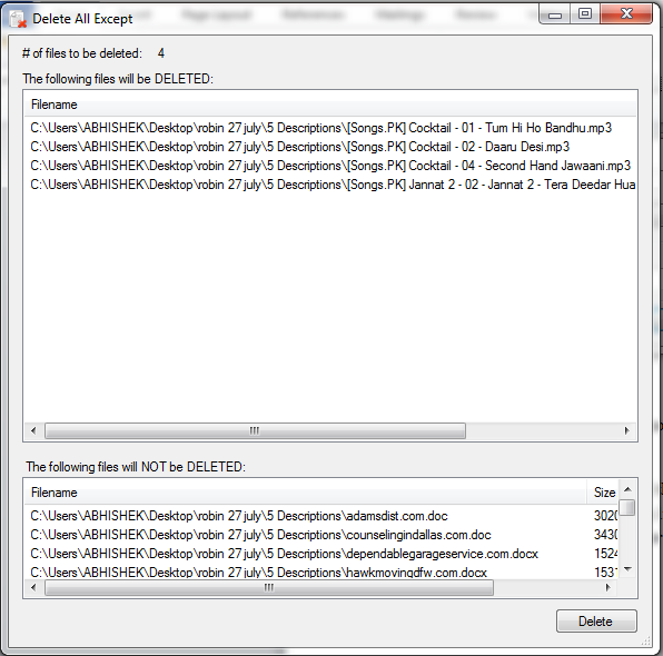 Free File Cleaner to Delete Bulk Files: Delete All Except Posted: 31 Jul 2012 05:00 PM PDT Delete All Except is a very efficient, free file cleaner that helps in deleting a set of files in a folder whereby giving you the option to select the files which you would like not to be deleted. People who use several file formats on their computer and save them in a single folder would find this free bulk file cleaner very useful when they wish to delete numerous files besides files of a specific name or a format. Using this free file management software is pretty simple wherein you need to be aware of the file formats and basic exploring knowledge. Installing this free file cleanerInstallation of this free file cleaner is easy where you need not do much more than just downloading and running the installation procedure. The first step involves downloading the zip file containing the executable file on your computer from here. Once you have the zip file you need to unzip it and launch the setup.exe file. After the installation process is over just click on the launch shortcut from your desktop and you are ready to use this free file management software. If you are looking for a simple file cleaning utility, you can try Xleaner, BleachBit Free and Hardwipe. Using this free file cleanerAfter you launch this free bulk file cleaner you would see a very simple interface with very few options on it. The window is a small one which has two blank spaces each representing the Folder location and the filters respectively. To begin with you need to be aware of the folder where you wish to delete specific bunch of files from. You need to be cautious enough about the location before you proceed to select the specific folder. The reason for this is that you might accidentally end up deleting all the files even the ones which you would have not liked to be deleted. The moment you click on the Browse option you would need to browse to the folder from the explorer that pops up. Once you have selected the folder the next step is to type in the format which you wish to be kept and not deleted. For instance in the screenshot below the folder we selected has .docx and mp3 file formats in the folder. Considering we had to delete all the mp3 files and leave the .docx files as they are we have to mention ''*.docx'' in the blank space at the bottom. Moreover the folder had some files of the ''*.doc" format so we can insert a ',' and filter the deletion process for two formats as well. Now when you are done with all the above the final step is to click on preview. Doing so will pop up a new window which lists down all the files that would be deleted as well as the ones which would be safe after the execution of the entire process. Moreover in case you wish to check out how many files get deleted after you run the deletion process you can check it at the top of the preview window. It lists the number of files that would be deleted right next to the heading ''# of files to be deleted''. Lastly to execute the process you need to click on the Delete button at the bottom of the preview window. This free file cleaning utility before execution would ask you if you wish to continue or not where after you select ''yes'' the files would be deleted. Please Note: While using this software you must be 100% sure about which files you are deleting and whether the formats inserted at the bottom are correct. In case you miss out on these the files cannot be retrieved once processed. Now that you know all about Delete All Except, you can use this freeware to delete a large number of files easily. Related posts: