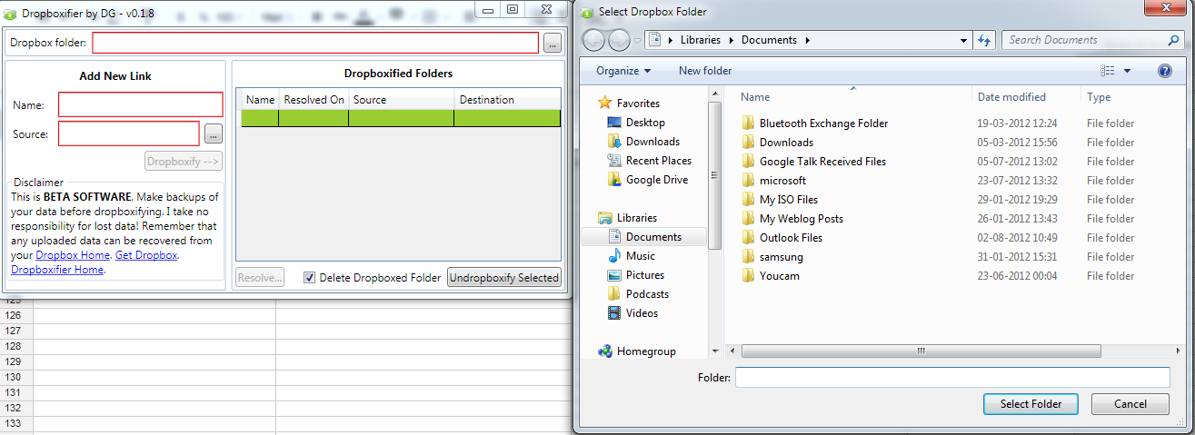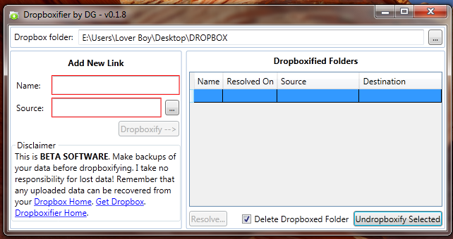 You will be able to see the added link in the "Dropboxified Folders" panel. Resolved links appear green and unresolved ones appear red. After you add a link, you can go to the other PC and resolve the link by clicking on the "Resolve" button. You can also delete a link by selecting the link and clicking on the "Undropboxify Selected" option.