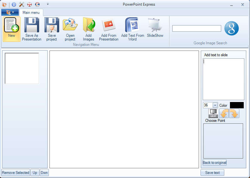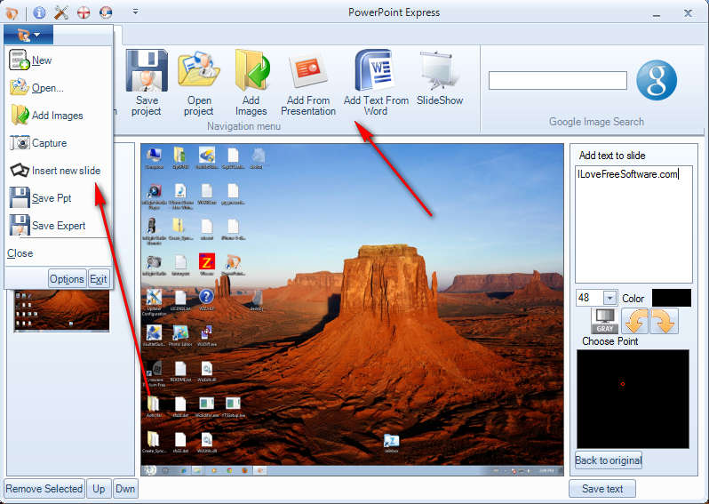 As you can see there’s a lot of things that you can do with this miniature version of Power Point and depending on how creative you are, presentations created with PowerPoint Express don’t have to look that bad. Here are a few pointers on how to use this small Power Point alternative in order to make your presentation creation a bit more easier to do. Similar software: Impress , Power Point Alternatives. How to create simple Power Point presentations quickly with PowerPoint ExpressWhen you first open up PowerPoint Express there won’t be any slides, so the first thing that you need to do would be to click on Main Menu and select Insert New Slide. After that you should see slide in the left sidebar. Let’s start with something simple, like adding text. The entire right sidebar is for text editing. In the input field at the top enter the text that you would like to see in the slide, and after that, switch over to the bottom where the red dot can be seen. Use this dot to position the text inside the slide. If it’s a title, place it somewhere at the top, if it’s slide text, then at the middle, below the title. Click Save text in the bottom right corner and after which you will be able to add new text. Use the upper toolbar to add images or import text from other documents. If you want to create a screenshot like we have on the image above and import it as a new slide, you’re gonna have to select Main Menu and then Capture. Visit the Main Menu also when you’re ready to save the presentation, but before that, click SlideShow to see it in action. ConclusionPowerPoint Express is a very useful application. It does its job good, since Office is a bit pricey, all those who need a simple presentation as a one time thing would have to waste money on nothing, but not with PowerPoint Express, the lightweight Power Point version. Free Presentation Creator: PowerPoint Express was originally published at I Love Free Software Related posts: