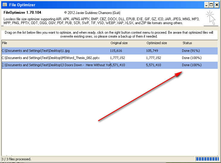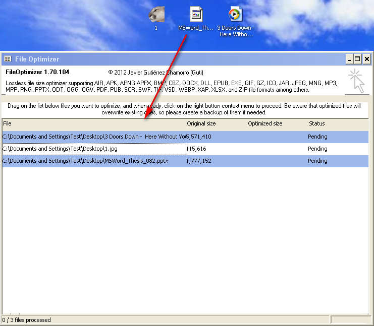 Before you start optimizing files with the help of File Optimizer there’s something that you should know. Files which are optimized are gonna overwrite the old ones so it’s a good idea, if you’re only interested in testing out File Optimizer, that you create backups of the files that you’re gonna be optimizing with the help of this free file and data optimization software. Similar software: Image Optimizer, Photo Vacuum Packer. How to optimize files and decrease their size with File OptimizerBeneath the list of supported formats that File Optimizer can open, you can find short instructions where it says that in order to start optimizing files you’re gonna have to drag and drop them to the main list. As you can see from the image above, we decided to test out a MP3 file, a JPEG image and a PPTX presentations. Note that older versions of Office documents cannot be opened, Office 2007 and newer will work, you can also recognize them by the addition of X to their extension. Keep an eye on the Original size column, because that’s where a very precise size of the files that you’re getting ready to optimize is located. To start the optimization right click anywhere on the main list and select Optimize. Results were a bit disappointing, as you can see from the image above. The most compression that we got was for an image, and the size was decreased for 9%. The MP3 files and the PPTX presentation weren’t compressed at all, but that doesn’t mean that they won’t be if you try it. ConclusionIf you have a large collection of files and you would like to decrease the size of it without compressing them in archives, which is a bit impractical if these files are something that you are accessing frequently, then File Optimizer is just the thing that you need. With this application you can easily optimize files, remove any overhead in size that they might have to save disk space. Results might not be great, but there are some, so try File Optimizer and see how it can help you out. Optimize and Decrease File Size with File Optimizer was originally published at I Love Free Software Related posts: