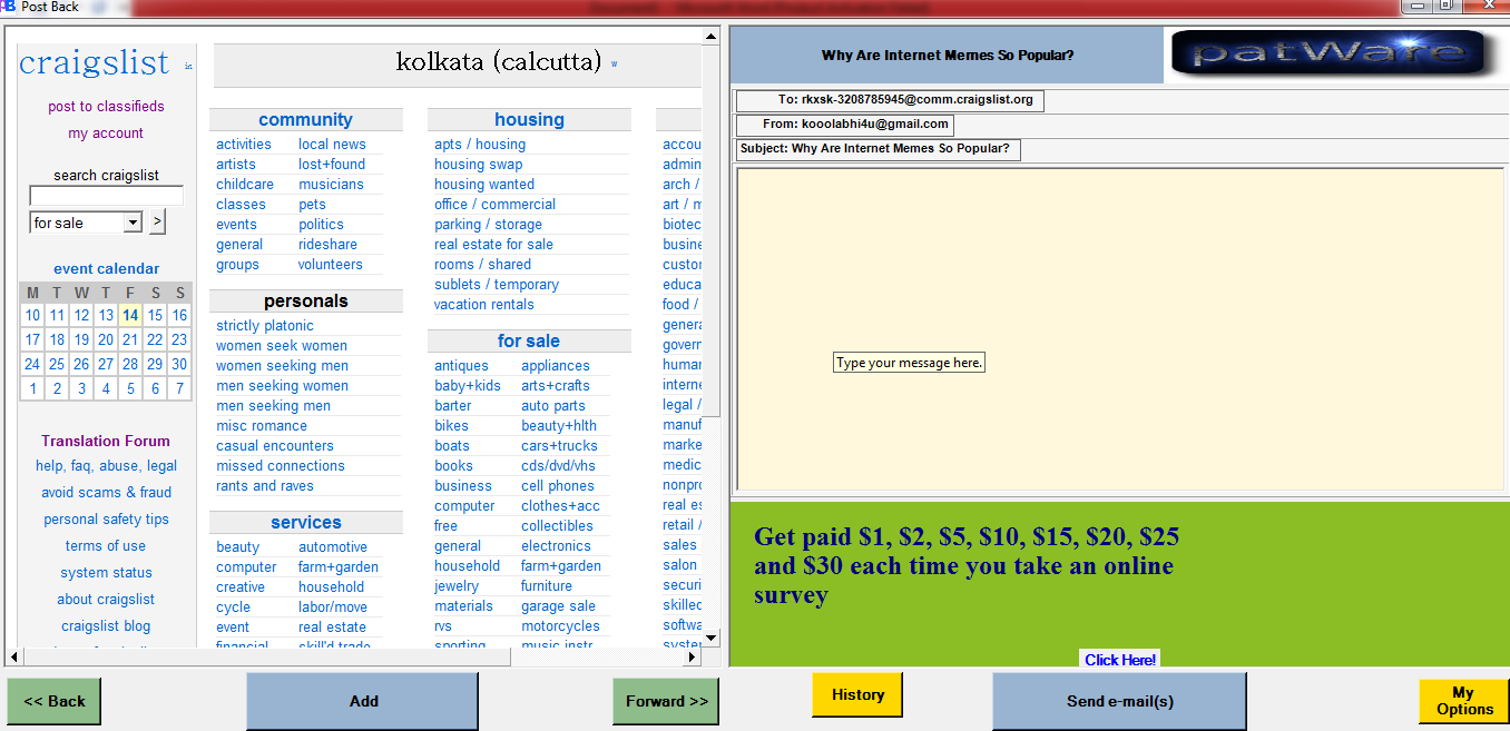 At the left panel you have an event calendar and a drop down that helps you search craiglist for specific options like community, events, gigs, housing, jobs, personals, resumes, for sale, services, etc. At the top left corner you also have the option to make a new post in craigslist. To select a specific post you need to click on your favourite category. After you click on the category you need to enter a keyword that suits your search. Then click the search button and a list of different posts will appear. Click on one post and it will be selected. After selecting the post, click on the Add button and an id will be added on the right side where you can compose your message. Now you can start composing an mail and click on the send e-mail button to send it to selected recipient. You will get the replies in the e-mail id that you entered as a primary e-mail address. You can even make new posts through this software. Click on "post to classifieds" that is present at the top left corner. Then you need to select the category for your post. Once you finish selecting a category you will be provided with a window where you need to enter the title for your posting, the location, the email address where you want to get replies, a nice description for your posting, compensation and click on continue to finish posting. Download Post Back for free. Free Craigslist Browsing Software: PostBack was originally published at I Love Free Software Related posts: