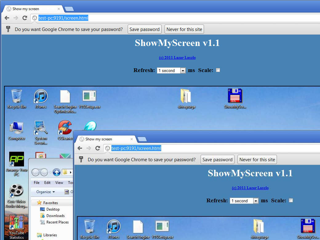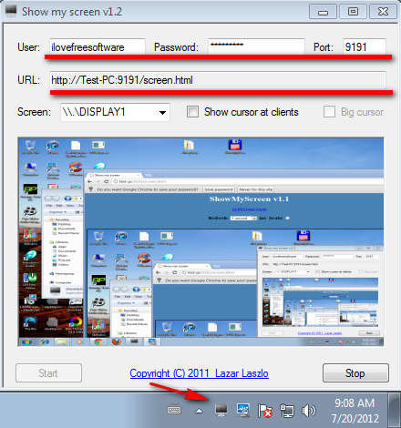 | Free Remote Screen Capture Software: Show My Screen Posted: 02 Sep 2012 06:30 PM PDT Show My Screen is a portable remote screen capture utility which can you can use in order to share with other people what you see on your desktop or for other people to share with you what they see on their desktop over the internet or a local network. This is only for remote desktop viewing, it’s not a full-fledged remote utility which allows interaction, but even without this, there are a lot of uses for Show My Screen, tech support for example. Interface is very easy to follow, it’s not necessary to go through a lot of setup in order for Show My Screen to start working, and best of all the application is portable, there’s no need for installation in order to use this free remote screen capture tool, just extract it, run the program and start configuring the connection options, which is what you can see on the image above. Similar software: Lite Manager Free, Desktop Now, Ammy Admin. How does free remote screen capture with Show My Screen work?First of all, we should clarify what exactly Show My Screen does, this is not a remote control utility, we mentioned several times that Show My Screen is only a remote screen capture program, which means that you can only connect to a live feed of the computer screen where Show My Screen is installed, configured and running. There’s no need for a client application, remote screen can be viewed from the browser. What you can see in the image above would be the Show My Screen remote capture in progress inside a Google Chrome tab. The URL which you have to open up inside Google Chrome will be given to you after you’ve successfully configured everything that needs to be configured in the Show My Screen main application shown in the first image above. Show My Screen configuration – free remote screen captureThe first step in configuring Show My Screen would be to enter the password and username which will grant the other person access to your computer screen. These login credentials will need to be entered when you type in the URL which can be seen in the second line on the image above. This address is what you have to visit with your browser in order to access the screen of the remote desktop. At the bottom of the Show My Screen window you can see Start and Stop button. The URL field will be empty until you click on the Start button. Show My Desktop server will then start working, the Preview screen should start showing you the image of your desktop and once you visit the URL that was generated by the application, you should see the same thing. Tech support can use Show My Screen to actually show customers how something is done, without needing to install anything or any kind of special setting up. Just share the URL to whoever it is that you’re trying to help, give them your username and password, after which they can just connect to your computer where you can show them what exactly it is that they need to do. Great tool. Free Remote Screen Capture Software: Show My Screen was originally published at I Love Free Software No related posts. |