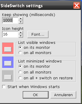 Interface And Working Of The SoftwareThe software is pretty easy to use once the user gets used to it. At first running the program might pose a problem to the user as it is difficult to understand if the program is actually running or not. I actually tried to run the program two or three times before I realized that it was already running. When the user’s pointer points to his or her mouse to the edge of the screen the list of the minimized windows appear. On the top one would find the minimized windows, then comes the list of visible windows, then the hide and clear options. The hide option hides the SideSwitch window temporarily. The clear option minimizes the current window . Changing the settings can appear to be troublesome too and the user will not be able to find any help anywhere. Once the SideSwitch window appears on pointing the mouse to the edge of the screen the user needs to right click on it. The first window allows the user to change the time for which the list of minimized windows will appear. Next screen enables the user to change the size of the icons. The font option lets the user to change the font properties of the icon. To the left one finds the option to change colors of the minimized windows, the visible windows and the options. The user can choose if he or she wants the list of visible windows to appear on its monitor or all the monitors connected. The cancel button has been strangely replaced with the Annuleren button. Downloading and installing SideswitchThe software can be downloaded from the official website of the publishers. The .exe file downloaded has to be run next and the installation is a simple and fast process. One can download the .exe file from other websites as well. Also check out how to create and switch between multiple bookmark bars. Final VerdictThe interface can appear to be confusing at the first glance but once you get used to it you should not have any problem. SideSwitch desktop enhancement utility will make switching applications really easy for you. Switch Between Applications Easily: SideSwitch was originally published at I Love Free Software Related posts: