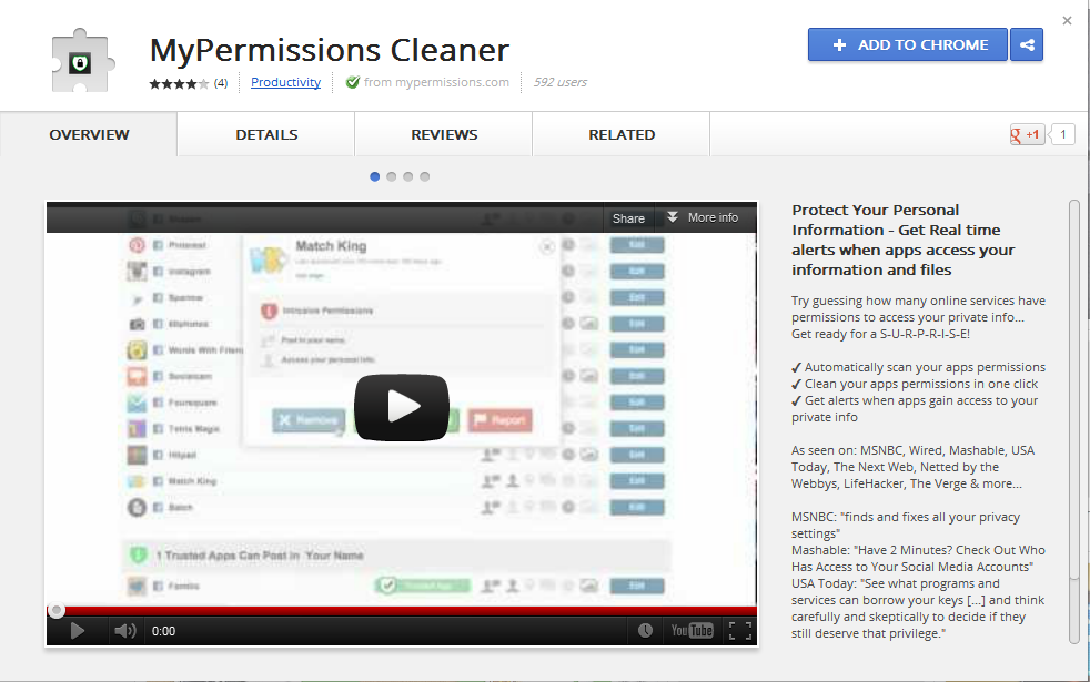 | Check Social Apps Accessing your Personal Info: MyPermissions Cleaner Posted: 03 Sep 2012 03:30 PM PDT MyPermissions Cleaner is a free Google Chrome extension that helps you to have a check at the apps that might be accessing to your personal info. Through this free social networking Chrome extension, you can stop all the third party access to your profile. Though the apps accessing your accounts in social media sites are not kept hidden but most of the times the user doesn't know which apps have been authorized to access their accounts. This is the best, free Chrome extension through which you can control all those apps and keep a check on the apps accessing your accounts. This is a free extension available for your chrome web browser and you don't need to register anywhere to use this. Installing MyPermissions Cleaner ExtensionTo install this free social networking Chrome Extension in your chrome web browser, you need to go here or you can simply search it in the Chrome web store. Once you find the free Chrome extension click on add to chrome and a zip file will be downloaded. The file automatically gets integrated with your browser and is placed near the address bar. If you are interested to check out some more Google Chrome extensions, you can try Skip Ads on YouTube, Time Stats and Lock Tab. Interface of MyPermissions CleanerThis free Google Chrome extension has a simple interface similar to any online app. It's like a scanner that scans your profile to stop third party intervention in your account. The app is present near the address bar and does not block or disturb your work. Using MyPermissions CleanerWith the popularity of social networking sites' increasing it has become important to use an app that keeps a control over the intervention of apps into your profile. The main use of MyPermission is to keep a check on your account and help you remove the apps that are using your accounts. One of the biggest examples is facebook. Different sites and apps used by you on facebook get access to your account. Many times they even get access to post on your behalf and access your friends' profile. There are many services that do this and MyPermission will help you control this issue. Though the service providers or apps don't hide any page from you, it is important to have a control over their functions in your profile. MyPermissions directly links you with the pages of eight social networking sites where you might be having your account; this includes Facebook, Twitter, Yahoo, Google, Instagram, Dropbox, and Flickr. After you click on the selected networking site's logo a new page will appear. You need to click on scan button and the app will start scanning your profile. The app may ask you to sign in before it scans your profile as it is necessary to mention the profile you want to scan. Once the scan is complete the app will list all the apps in your profile and provide you information about their activities in your account. Once you get the information about all the services in your account you can go to the edit option and make the appropriate changes. For example if you scanned you facebook profile then you will get the information about the apps that have been posting on your behalf or the apps that have been accessing your and your friends' profiles information. The app reminds you once a month about the intrusions in your profile. You get a list of all the intrusive apps and manage them. People who use many different apps on a regular basis should use look out for this extension as it is helpful and a handy extension that improves your privacy. You can even set the date for a reminder and MyPermissions Cleaner will remind you about the apps on the specified date. Check Social Apps Accessing your Personal Info: MyPermissions Cleaner was originally published at I Love Free Software No related posts. |
