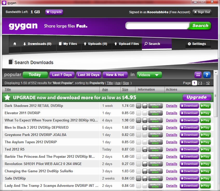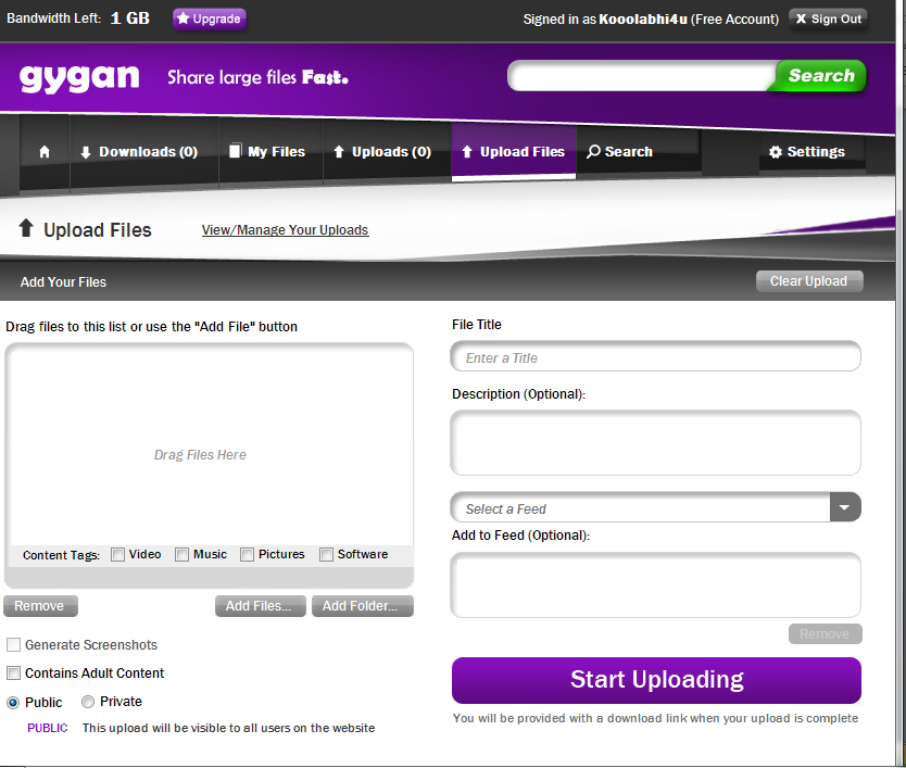 The downloads section takes you to the screen where you have all your downloaded files and also shows the downloads that are currently on. The My Files tab has all the files that you have in your library or might have downloaded. Through the uploads tab you can have a look at the files being uploaded or the files that you have already uploaded. The Upload files tab helps you Upload different files from your computer. To upload the files you need to click on select files or just drag the file into the software. Then you need to select options whether the files contain adult content or not and whether you want to make it private or public. Then just enter the title and description of the file and click on start uploading to upload the file. The settings folder enables you to change the folder where you want to store the downloaded files. If you don't have a specific video name in your mind and want to download some of the most trending videos, then just click on the search button. All the trending and most downloaded videos will appear on the screen and you can select one among them. Free File Sharing Application: Gygan was originally published at I Love Free Software Related posts:
