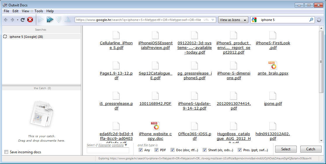 After you find the documents that you were looking for and that you are interested in, simply drag and drop them all to the lower left corner of the application window in the Catch area where you can create document collection and of course open them. ConclusionIf you are looking for a way of how you can speed up document searches then OutWit Docs is just the thing that you need. Some experience is needed to fine tune the search and receive more accurate results faster, but with time you’ll get a hang of it and you’ll be finding documents that you’re searching for very quickly. OutWit Docs is gonna integrate itself into Firefox and it can be easily called up from the toolbar, document search is fast, and very precise. Search document names directly with OutWit Docs. Download and Search Documents with OutWit Docs Firefox Extension was originally published at I Love Free Software Related posts: