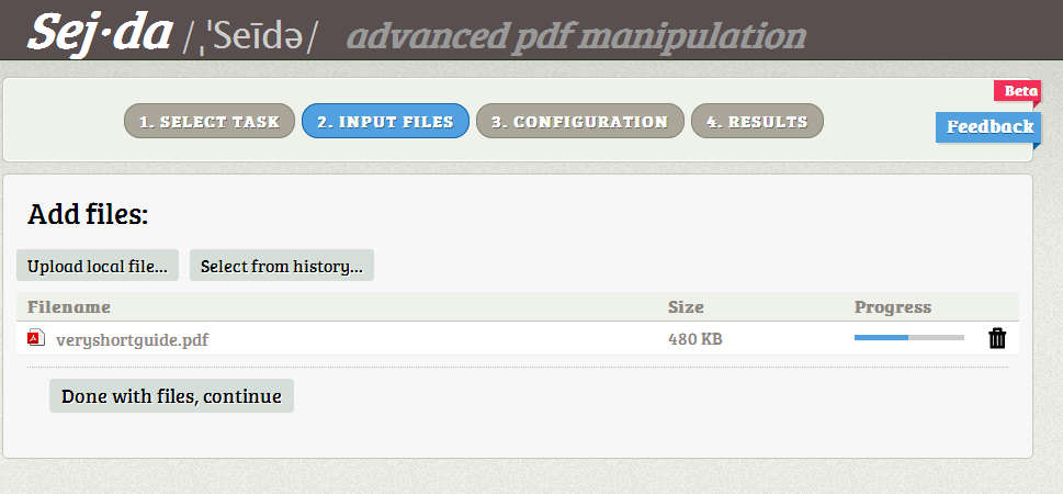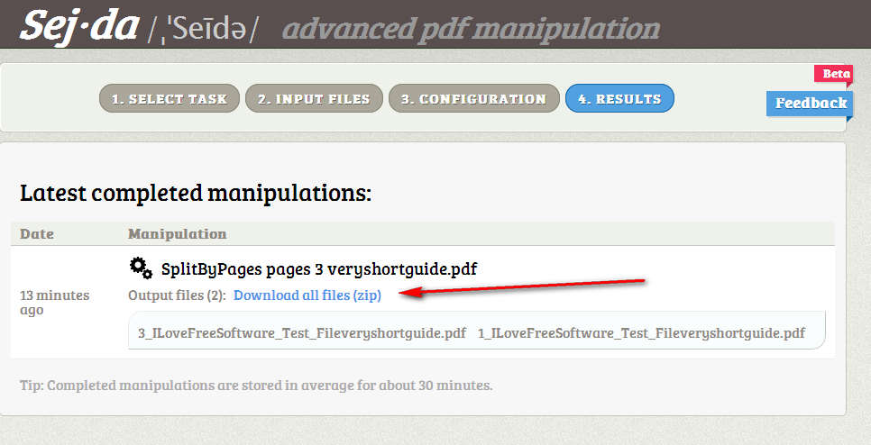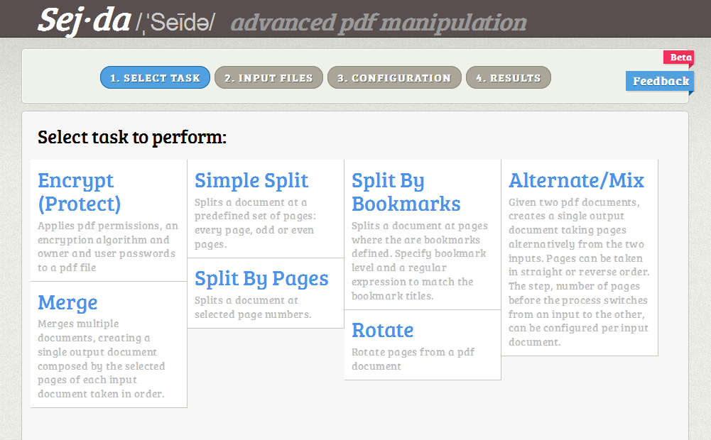 Notice that we said PDF editing tools offered by Sejda so far, that’s because there’s more of them in the making. For example, very soon there should be decrypt, text extract, split by size and a few more made available in the near future. Until then, use some of the ones which are being offered now. Similar software: PDFEdit, PDFRider, Online PDF Editor. How to edit PDF documents online with SejdaFor the purpose of this demonstration we are gonna split a PDF file at certain number of pages by using the Split By Pages option. Start by clicking on the Split By Pages from from the Sejda home page. Once you do that you should see the second step of the wizard where you need to select the PDF files that you want to edit. PDF documents of course have to be uploaded. Once they are finished uploading, you should proceed onto the Configuration, where in the case of Split By Pages tool you can set the page numbers where you want to split the document. We’ve decided that we wanted to split our document at the third page, so we entered that in the split by page box, and clicked Next. Sejda will then go through the splitting process and when it does its thing, you should receive a report with download links for the split files. ConclusionEven though Sejda is still in beta, like you can see from all the images above, it works just fine. All the tools that we tested have done their job well. Speed also wasn’t an issue, PDF documents that we manipulated with Sejda were processed very quickly. There’s no downloading or program installation of any kind to test this free online PDF editor, so why not give it a spin. Just open up the main website and start editing your PDF files online. Free service. Online PDF Editor to Merge, Split, Encrypt, Rotate PDF Online: Sejda was originally published at I Love Free Software Related posts: