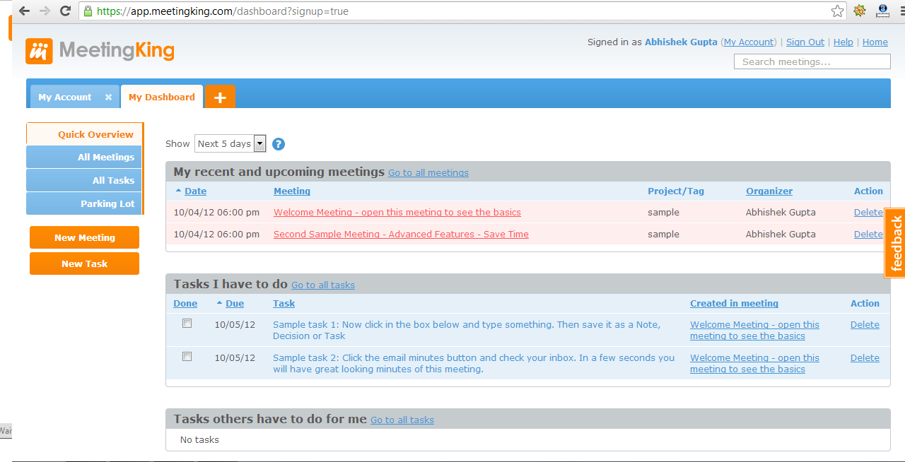| Manage Meetings Online With MeetingKing Posted: 29 Oct 2012 11:00 AM PDT MeetingKing is a free service which can be used to manage meetings , professional meeting minutes, tasks, and several other things online. It let’s you manage virtually every other thing which you might be managing in your day-to-day business operations. This free online meeting organizer comes with advanced management options which are available in both free and paid plans(of course more advanced options in paid plans). Some of the notable benefits and features of the tool include automatic document creation, faster and easier note taking, linking related tasks, agendas and minutes, and much more. Being an online app you might wonder if your data is protected while you use this tool to manage meetings. If that's the case you should be relieved, as the application uses a SSL encryption for transferring your data while using industry standard back-up procedures. Registering at MeetingKing to Manage Meetings:Before you actually start using this free online meeting organizer you would have to register at the website. The registration process is pretty simple where you just need to click on the register option available at the website. Once you do so it would ask you to create your new id on the site. You may register using your Google Account or your Facebook id or go for a fresh registration with your email id. There are a few more options you need to click on before you are ready to use this free meeting management service. If you are looking for a good, free online meeting scheduler, you can try Doodle, Tungle, and ScheduleOnce. User Options Available at MeetingKingOnce you have registered on the site you would be brought to the Dashboard where you would have all the options available. The Dashboard looks quite attractive with the use of blue and greyish color tone to it. At the extreme top of the window you have the options to check and modify your account details, sign out, and visit the home page. Below this you have the tabs for your Account where you can set up your account information, set your preferences or upgrade to paid versions. Under the free version you may use only a single account and have the only feature of creating meetings. The other advanced options are only available with the paid versions of this free online meeting organizer. You may even use the Synchronization option, with which would synchronize your Google tasks with your Meeting King account. To use the basic function of creating your meetings and managing them you need to click on the Dashboard which would give you the options to create new or view the already existing ones. Using MeetingKingIn order, to create a new meeting or a new task you need to click on their respective tabs on the left side of the main Dashboard. If you are connected through your Google account, it would give you the popup to integrate your newly created tasks and meetings with your Google Calendar. Here, you can set the meeting name, invite the people important to the meeting, schedule a follow-up, edit the agenda and more. Click on save when you are done modifying the options and inserting texts in the relevant boxes. In the similar manner you could create your new tasks mentioning the users concerned with each. Besides having the summary of the tasks, scheduled meetings, and other relevant things that you might have taken a note of in the Dashboard, you can see all your created tasks, meetings, things to do in their dedicated tabs accessible from the left of the dashboard. When you visit the parking lot section you could leave specific messages for others to view or post latest progress of tasks, meetings or schedules. Overall, this tool to manage meetings is a pretty decent application to manage all your tasks, meetings, etc. For small-scale organizations this could be a perfect solution to manage tasks, delicate responsibilities, set reminders, and communicate. MeetingKing is a free online web application which helps you to organize and manage meetings in an effortless way. Download and try MeetingKing Free. Manage Meetings Online With MeetingKing was originally published at I Love Free Software Related posts: