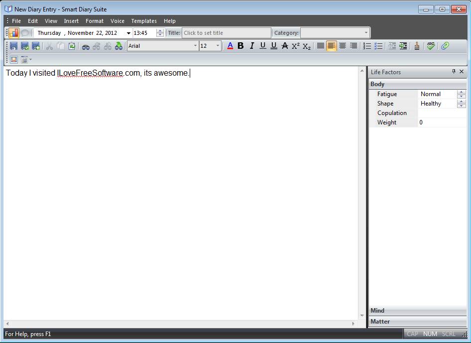 Note that next to the free version of Smart Diary Suite there is also a paid version available which offers more features like for example the ability to take notes, keep track of nutrition, medication, contacts, change themes, and so on. Here, are few tips to help you get started with this free diary and task management application. How to Run a Diary on Your Computer and Keep Track of Tasks With Smart Diary Suite?After installing and running Smart Diary Suite for the first time, you’re gonna have to create a diary to be able to use it in the first place. It’s very simple just enter your name and password and click Add. Once you’ve done that you can add a diary by clicking on the New entry icon in the top left corner menu. You get a full editor which you can use to format the text in any way you like. On the right, you can keep track of your health stats like fatigue, shape, and so on. When you’re done select File >> Save and Exit, and your new diary entry is gonna be added. This would be the task management part of the application. Everything will be pretty much the same. Click on the New task icon and a new task window will appear where you can enter task name, time within which you need to complete it and when you’re done, again click File >> Save and Exit. Conclusion:Smart Diary is free and very feature rich journal and diary software which you can use to keep a track of things happening in your day-to-day life. Try it and see if it can help you out. Click here to try some other free Journal software reviewed by us. Smart Diary Suite: Free Journal Software To Keep A Record Of Your Life was originally published at I Love Free Software Related posts: