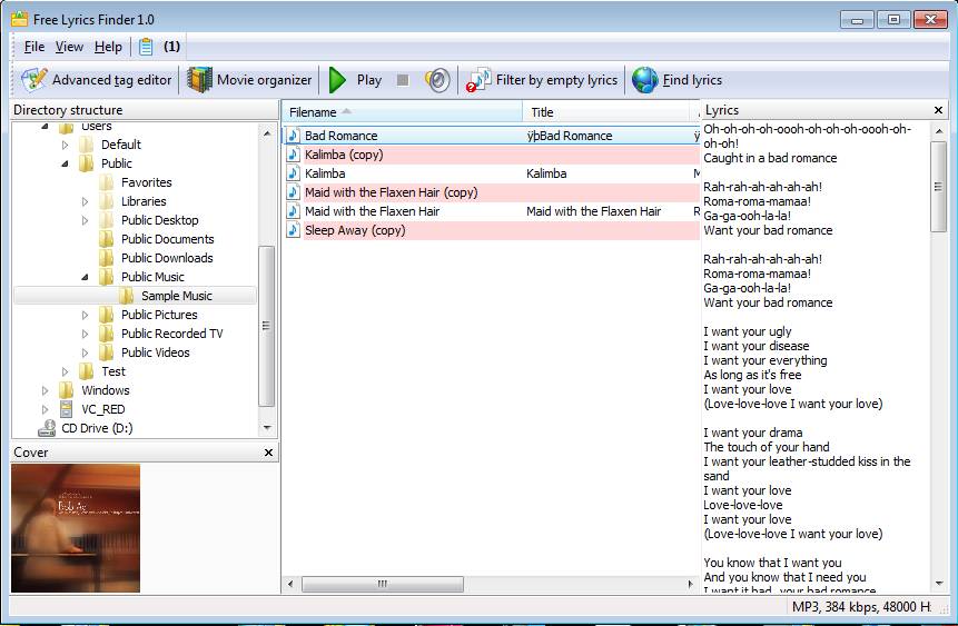 Very few people are aware of the fact that they can add lyrics to song. What majority knows is that song can carry artist name, song title, album info and so on, but not lyrics. They are useful when you listen to a song which isn’t very understandable. Free online lyrics search offered by Free Lyrics Finder will allow you to rediscover your music. How to Search and Automatically Download Song lyrics with Free Lyrics Finder?Use the file browser on the side in order to find your music collection, where your songs are stored. Once that you open it, you should see a list of songs loaded to the main list on the right. By clicking on the song name from the list you can edit its name. Song name is important because that’s what the program is gonna use when searching for the lyrics. There’s a song preview option if you don’t know the song name. When you’re done filling out the name, select the songs who’s lyrics you want to find out and embed. Then you need to click on the Find Lyrics button. Few seconds later you should see song lyrics in the right Lyrics sidebar. If they are not there you need to make sure that your song name is written properly, all the ID3 tag info has to be filled out properly. For finding missing ID3 tags you may try Free Music Tag Finder reviewed by us. ConclusionFree Lyrics Finder is a very useful tool that does its job very well. Be careful while installing it because it tries to install additional software during installation. Application is very fast and searching song lyrics is very easy with it, plus you also get automatic album art download, next to lyrics. Try it out and see yourself how useful Free Lyrics Finder really is. You may also try Chrome Song Lyrics Extension and Lyrics App for Windows 8 reviewed by us. Download And Embed Song Lyrics Automatically: Free Lyrics Finder was originally published at I Love Free Software Related posts: